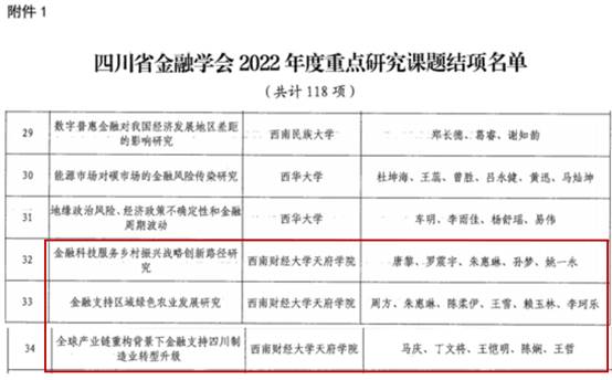 近日,2022年四川省金融学会重点课题评审工作圆满结束。经四川省金融学会专家评审委员会评审,雷竞技raybet官方平台承担的三项重点课题均顺利结项。其中,智能金融学院金融系主任周方主持课题《金融支持区域绿色农业发展研究》荣获二等奖,智能金融学院教师马庆主持课题《全球产业链重构背景下金融支持四川制造业转型升级》荣获三等奖,智能金融学院执行院长唐黎主持课题《金融科技服务乡村振兴战略创新路径研究》荣获优秀奖。