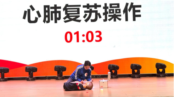 决赛共计6支队伍,涵盖心肺复苏+AED操作(双人)、左手背出血包扎和左前臂骨折固定三项内容。决赛现场气氛热烈,参赛队伍以严谨的态度、高效的操作和出色的团队协作,为观众和评委们呈现了一场精彩的急救技能展示。最终,学校参赛队伍以总分281.1的高分获得团体一等奖。
