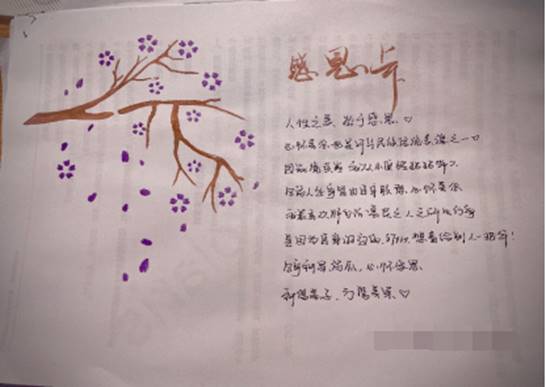 本次活动由“团学君”和各班生活委员进行宣传,线上开展。参与者可以选择独立制作一张感恩卡,用来表达心中的感恩之情,也可以通过观看视频,写出个人对“感恩”二字的领悟。同学们的感恩卡和感悟,承载着大家最衷心的祝福和感激,体现了同学们对“人性之美——始于感恩”的深刻理解。