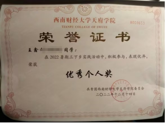 他曾获得第十三届全国大学生电子商务“创新、创意及创业”挑战赛四川省赛区一等奖、第九届互联网+大学生创新创业大赛校赛一等奖一项、二等奖一项、五四评奖优秀青年志愿者、获得国家励志奖学金等。