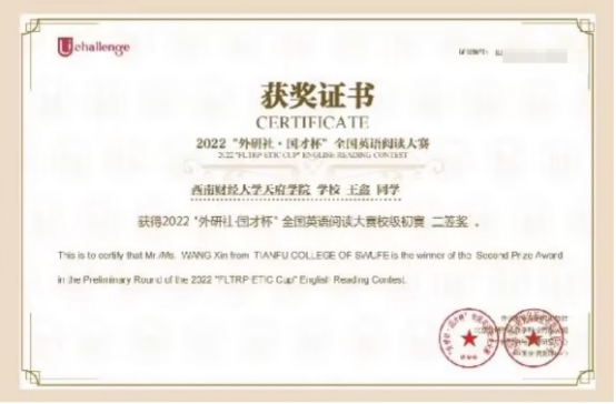 王鑫2022全国英语阅读大赛校级初赛二等奖获奖证书